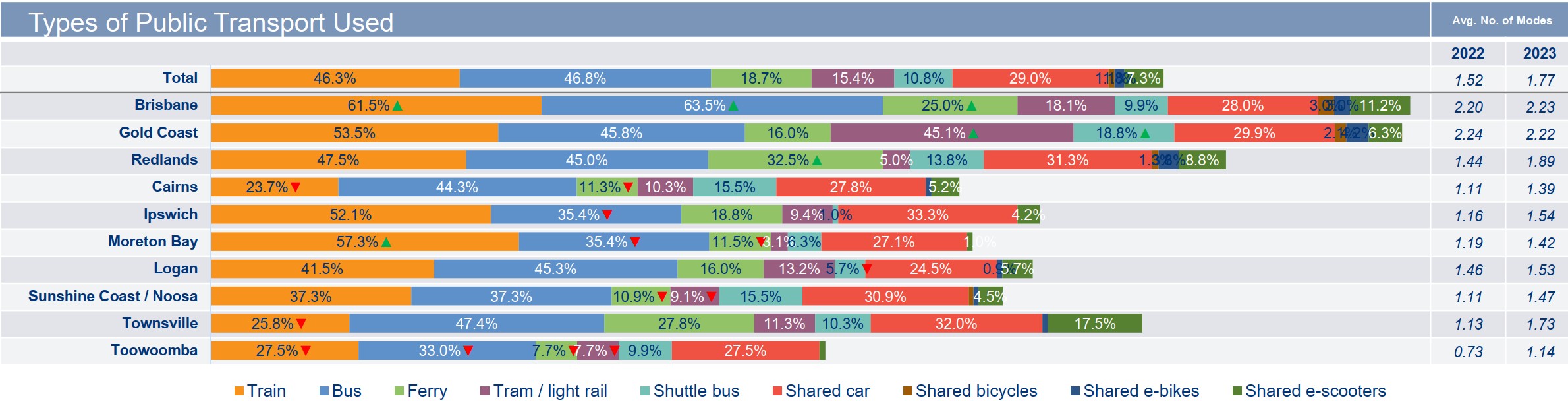 Public transport usage (% of commuters) by mode in Queensland LGAs: