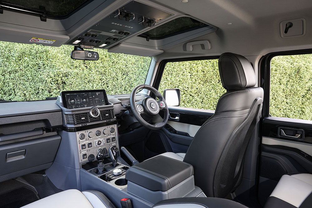 The wheel can be optioned with a specific saddle-leather trim designed to age with use, and houses the usual audio and cruise control switches, plus a red ‘toot’ button designed to politely alert cyclists and pedestrians of the Grenadier’s presence.