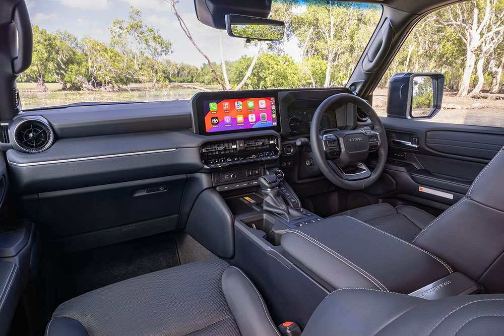 The dash and door trims feature more soft-touch materials than we’ve come to expect in a Toyota 4x4 and there’s a 12.3-inch multimedia touchscreen on all grades equipped for wireless Apple Carplay and Android Auto.