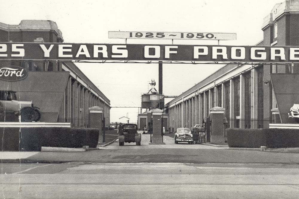 Entry to Ford's Geelong factory in 1950, its 25th anniversary.