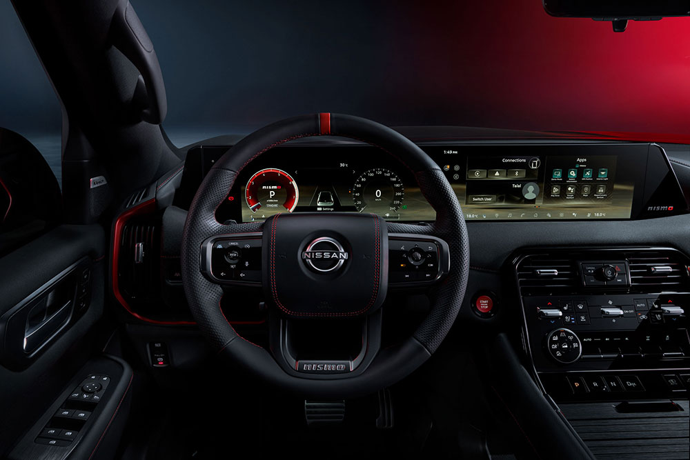 Nismo-red exterior accents highlight the Patrol’s performance potential, while inside the cabin there’s a striking black-and-red colour scheme, with contrast stitching on the dashboard, seats, steering wheel, and doors.