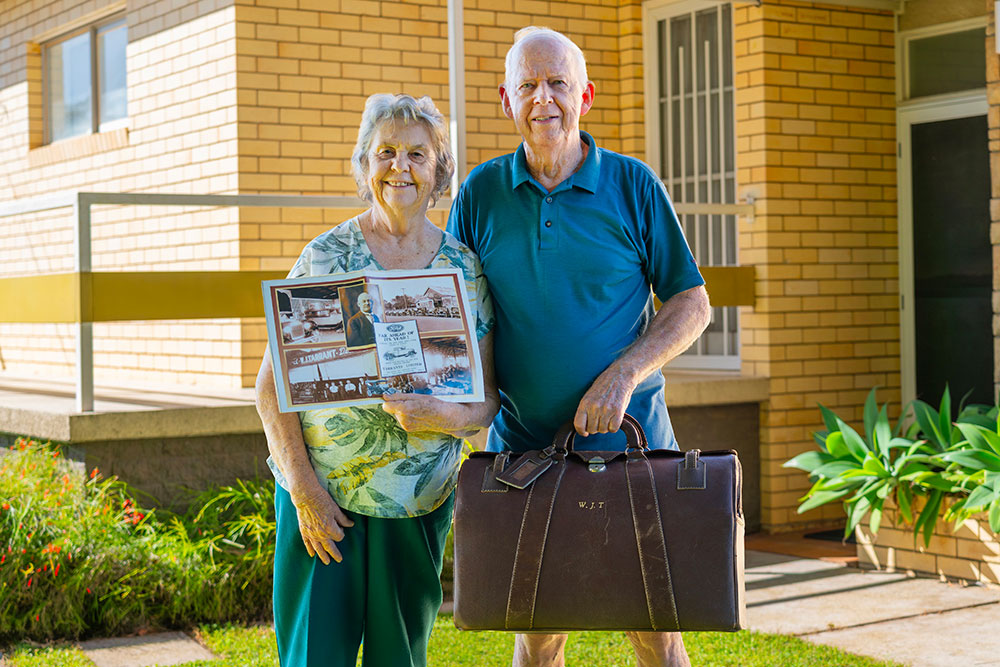 Glenda and Jack Eagle with a bag owned by William J. Tarrant and a poster featuring historic photos of the long-time Ford dealer in Maryborough.