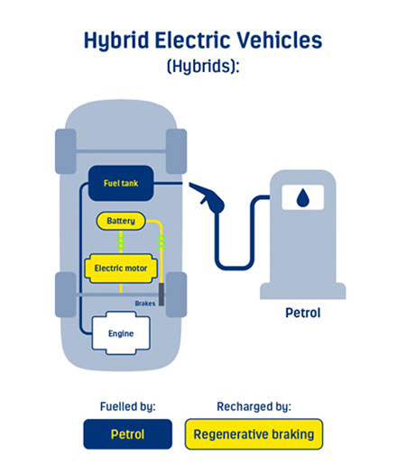 A standard hybrid has a small high-voltage battery or traction battery (much smaller compared to a full battery electric vehicle (BEV) and it works in conjunction with the internal combustion engine to capture energy when braking and decelerating and then reuses it under acceleration to reduce fuel consumption.
