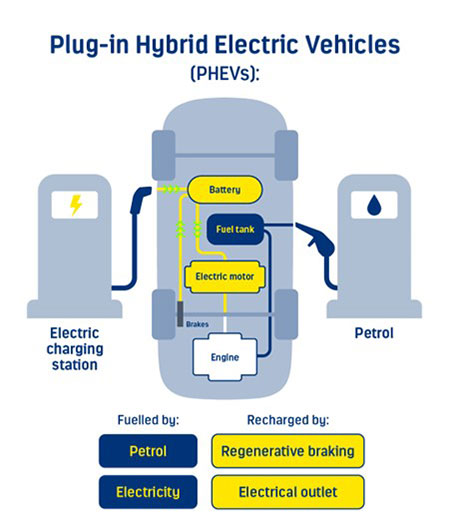 A plug-in hybrid electric vehicle (PHEV) is a hybrid with a larger battery pack, that can be plugged in to a suitable power outlet and recharged, unlike a standard hybrid that recharges from regenerative braking and cannot be plugged in and charged.