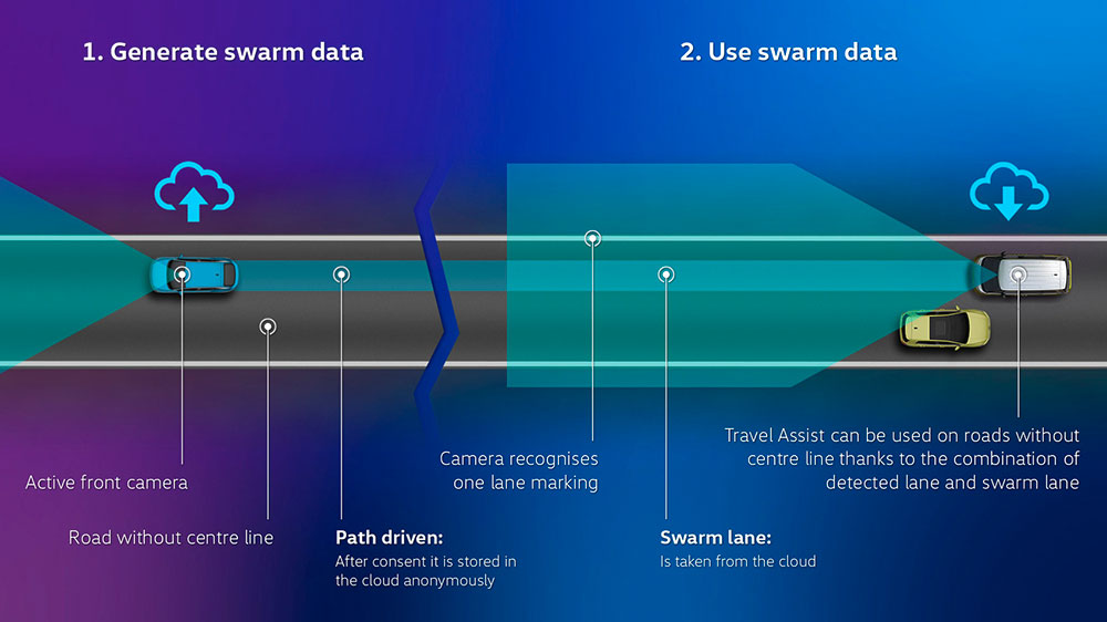 Swarm data takes information from other VW vehicles and uploads it to the cloud to then inform other vehicles.
