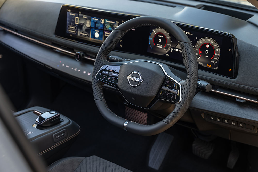 With weight distribution close to 50/50, and a decently quick 14:1 steering ratio the Nissan EV felt suitably dynamic through the bends, although it’s positioned more as a family hauler than a performance model.