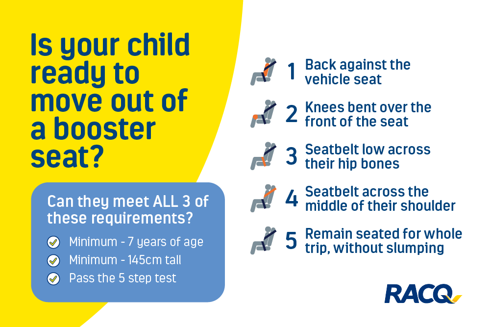 RACQ Education Lead Louise Hart said while 7-year-old children can legally move from a booster seat, we recommend parents do this test to ensure their child meets the correct safety requirements.