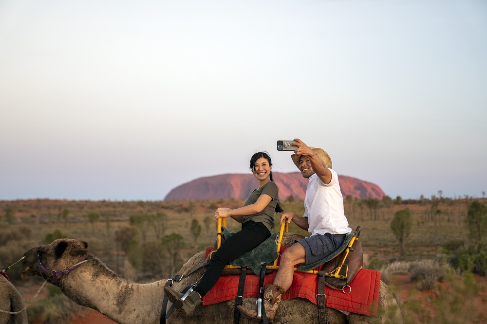 Couple posing on a camel with Uluru in the background. Photo: Tourism NT/Rhett Hammerton.