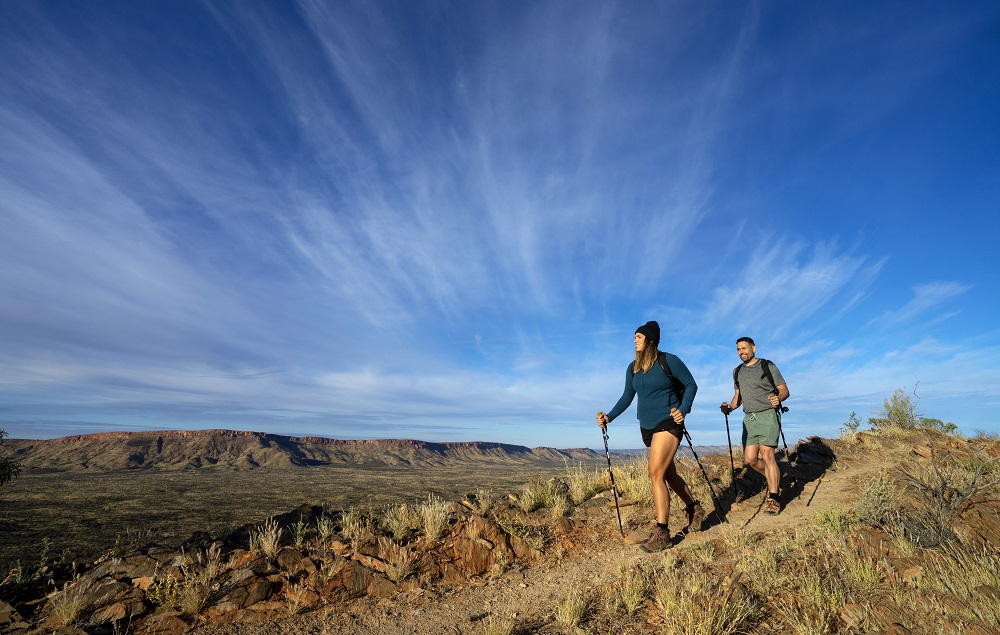 People hiking along the Larapinta Trail at Euro Ridge. Photo: Tourism NT/Shaana McNaught.