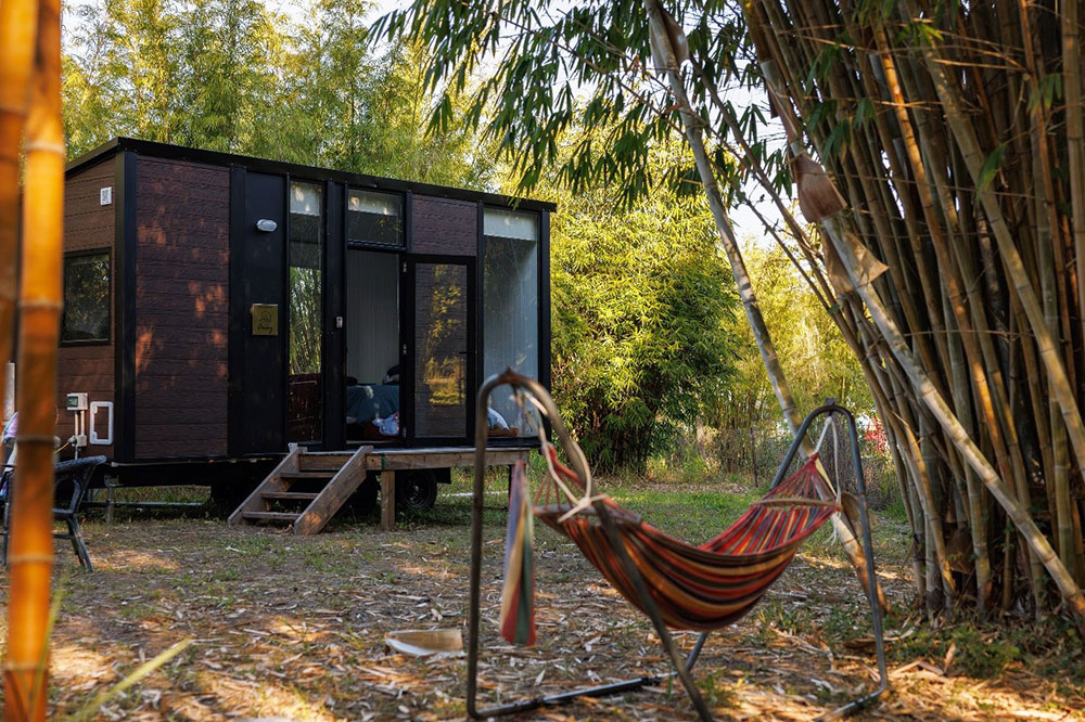 A step up from glamping, each tiny house offers hot showers, air conditioning, a cosy queen bed, and a kitchenette.