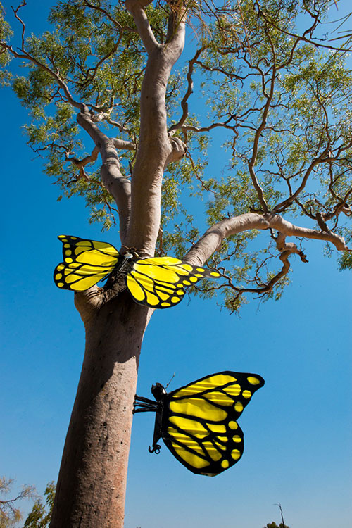 What follows is one sculpture after another and driving is very much a stop-and-go session: Amongst others there is a pig on the roadside, a gigantic spider lurking in its net, an aeroplane placed in a paddock with hundreds of termite mounds and a chopper with a friendly waving pilot at Clare Station. Highly dynamic are the sculptures of "Cutting Horse Cowgirl" and "Bronc", a tribute to the Ballyneety Rodeo. This section also features one of Milynda's newer creations, two yellow-black butterflies that cling to the smooth trunk of a large gum tree.