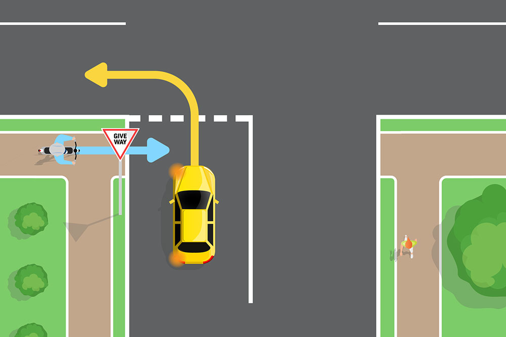 The below quiz, published on social media, asked Queenslanders: If an e-scooter rider is intending to exit the footpath to cross the road and the yellow car has pulled up to the line, who gives way?