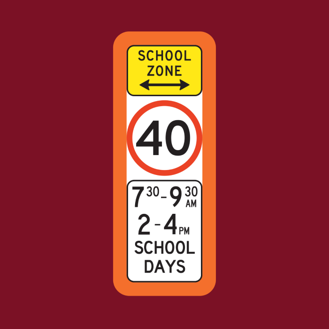 Most school zone signs in South East Queensland require road users to travel at no more than 40km/h from 7-9am and 2-4pm on school days. Note: Portable cameras are being used in school zones across Queensland until the end of July 2025 in a pilot study assessing if they impact driver behaviour.