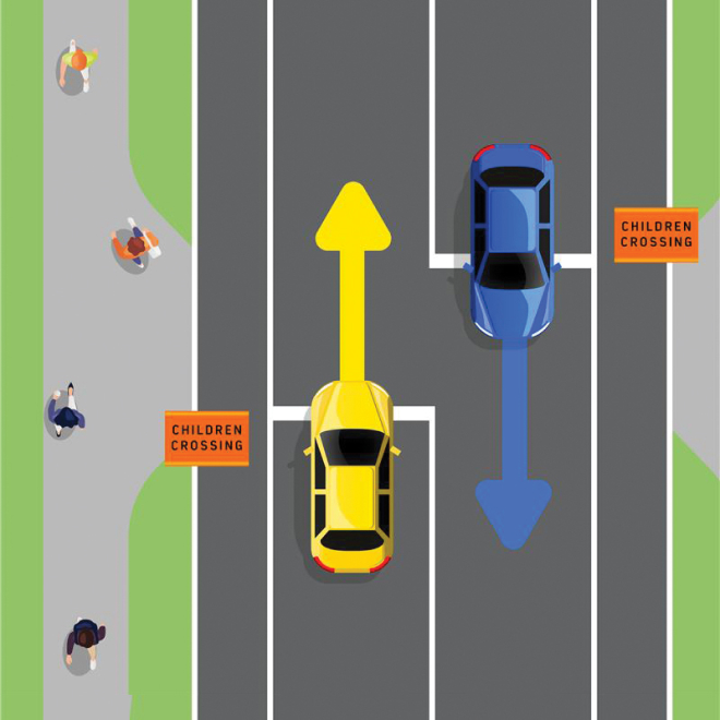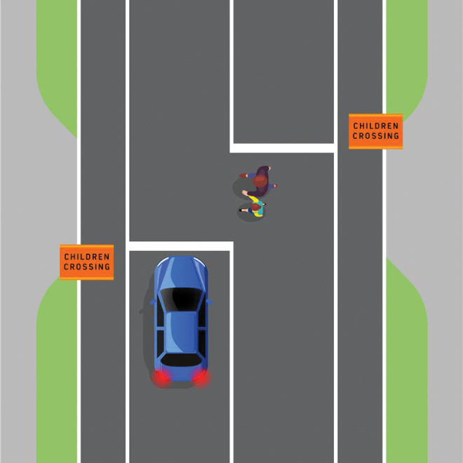 A driver approaching a children’s crossing marked by flags or signs and lights must drive at a speed so they can stop safely before the crossing if needed. They must stop if a hand-held stop sign is displayed at the crossing or a pedestrian or rider of a bicycle is on or entering the crossing.